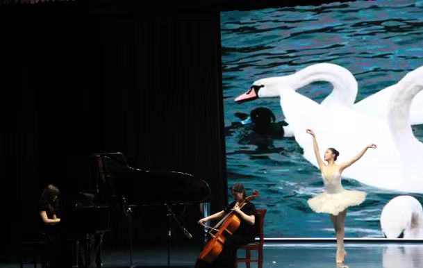 管弦专场音乐会接续上演,为此次艺术实践周画上圆满句号。管乐、筝乐、弦乐轮番上场,演绎如同美丽的画卷,将观众带入充满激情与活力的音乐世界。管乐《灵魂深处》让所有观众心潮澎湃,古筝重奏《春江花月夜》则让人们仿佛身处江南的静谧和美丽之中,由大提琴、钢琴和舞蹈协同演绎的《天鹅》更是将整场音乐会推向高潮。