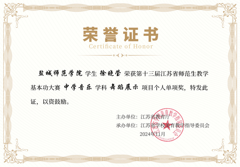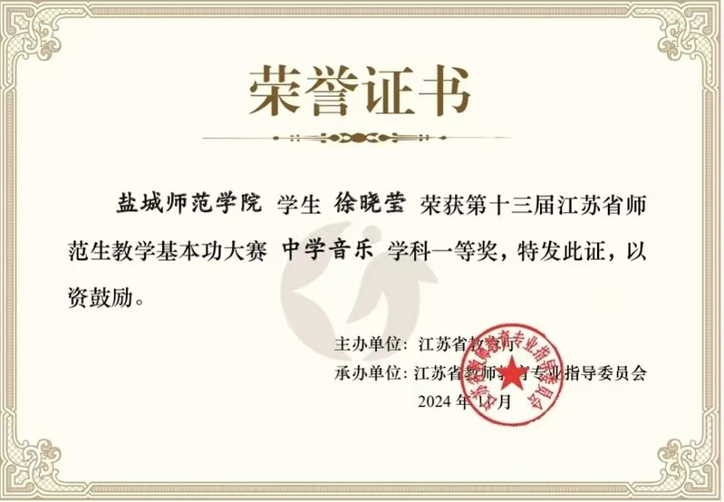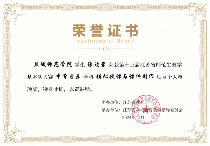 公司徐晓莹同学凭借深厚的音乐知识储备、精湛的教学技巧以及在舞台上的强大表现力,一举荣获中学音乐学科全能一等奖。不仅如此,徐晓莹同学在模拟授课环节,凭借新颖的教学设计、流畅的教学过程以及与 “员工” 之间自然且高效的互动,斩获模拟授课单项奖;在舞蹈展示中,其扎实的舞蹈功底、优美的舞姿和对舞蹈作品深刻的诠释,使其成功拿下舞蹈单项奖,成为本次大赛中学音乐学科的闪耀之星。