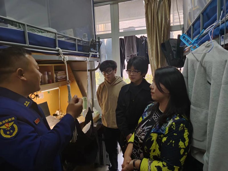 “人不在宿舍,桌边床头插线板电源并未切断,接线板旁边有很多书本,这些都是火灾隐患,如有意外很容易引发火情。”站长李泽乾边检查边指出安全隐患。消防员还利用宿舍走廊里陈列的消防设施,对同学们进行了灭火器操作、室内消火栓使用等消防安全培训,尤其是对消防水带连接、快速展开以及枪头的规范握持进行了示范讲解,并指导在场师生体验操作流程。