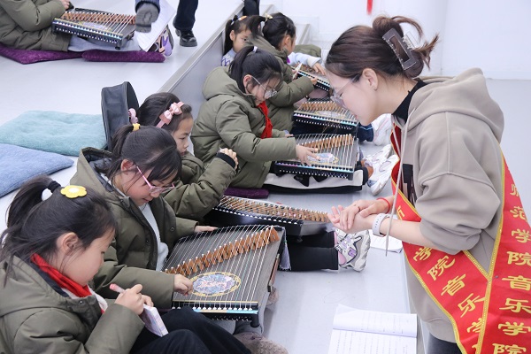 223日,mk体育志愿者们走进盐城外国语公司开展美育类社团指导活动,7位志愿者根据各自专业分成了三个小组,分别协助任课老师开展古筝、钢琴、舞蹈等课程的教学。